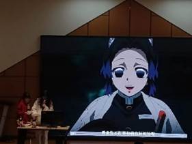 活动中,同学们不仅充分展示了日语学习的成果,为观众带来一场视听盛宴,也加深了同学们对日语学习的兴趣与热爱。惟妙惟肖的配音表演《鬼灭之刃》,仿佛将我们带入了一个充满想象力的世界。动人的歌曲《奏かなで》仿佛让我们再次体验了动漫《一周的朋友》中的感人瞬间,也展现了对日语的深厚热爱和才华。多人唱跳表演《新宝岛》和《虫王战队op舞》展现了同学们的青春力量与活力,再现了战队的和谐与团结。舞蹈表演《马儿蹦跳传说》生灵活现地表现出角色的活力,也激励着每一位同学都可以像动漫中的角色一样,会不断前进,朝着眼前的终点奋力奔驰。