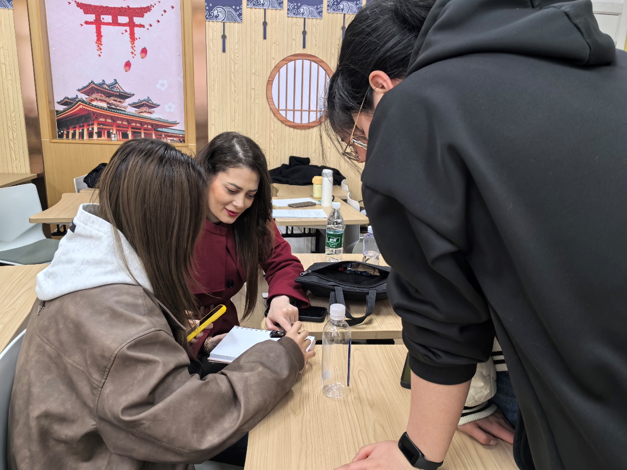随后,中法学生结成混合小组,共同练习唐诗朗诵。中国学生耐心示范发音与节奏,法国学生则认真模仿,现场气氛热烈欢快。尽管语言差异带来挑战,但笑声与掌声始终交织,诗歌成为跨越国界的共同语言。