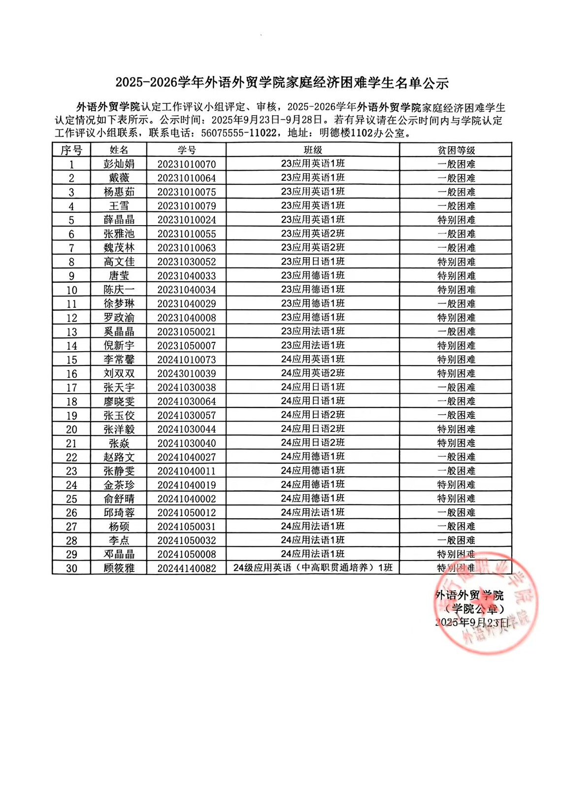2025-2026学年外语外贸开云online(中国)家庭经济困难学生名单公示