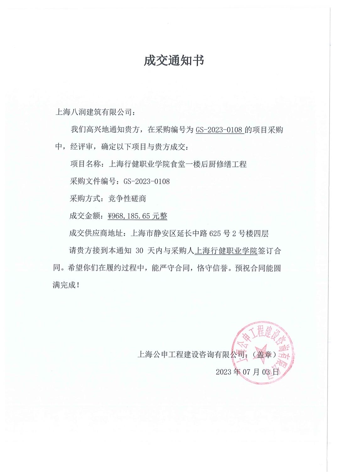 成交通知书 GS-2023-0108 开云网页版页面食堂一楼后厨修缮工程