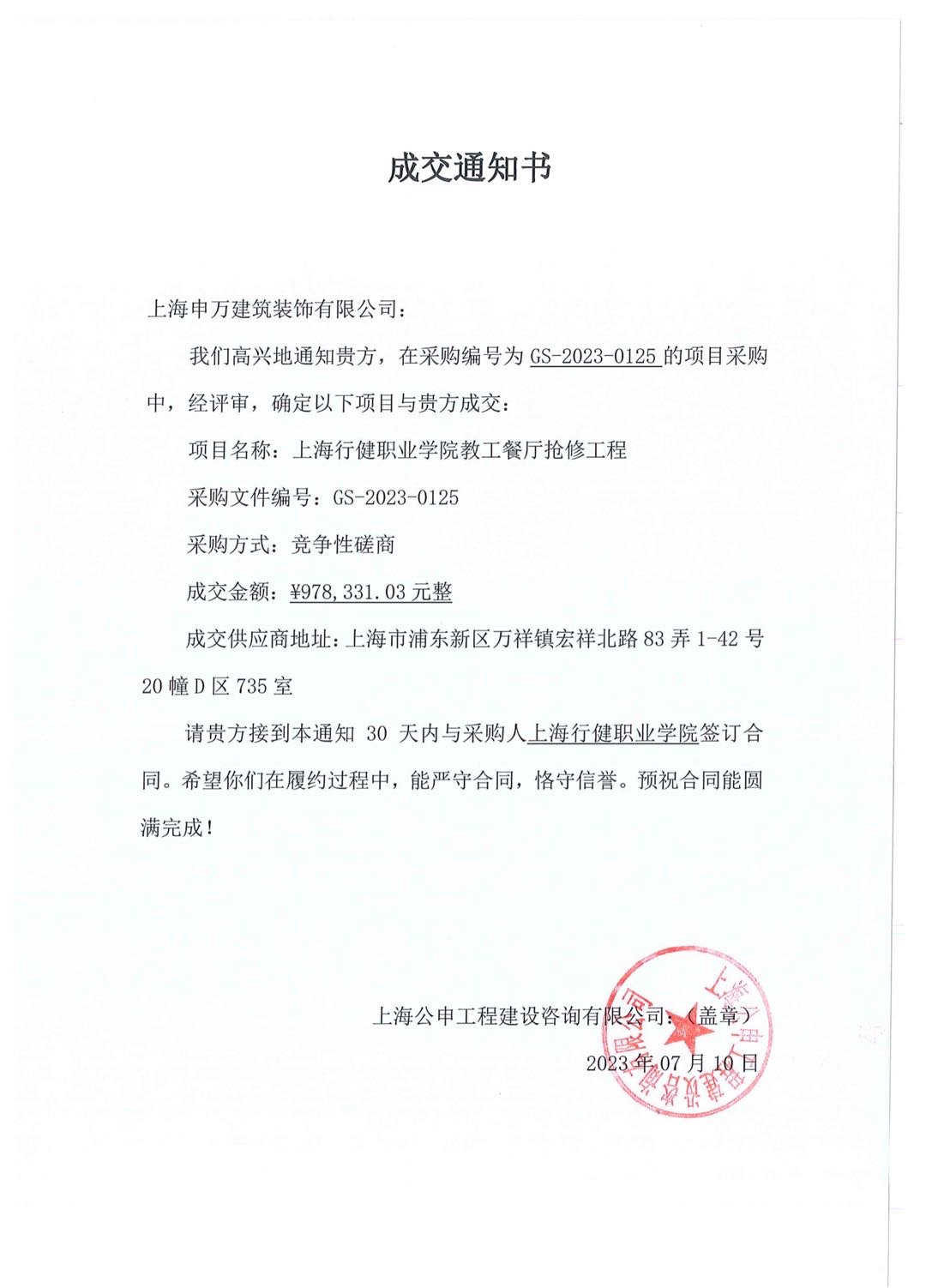 成交通知书 GS-2023-0125 开云网页版页面教工餐厅抢修工程