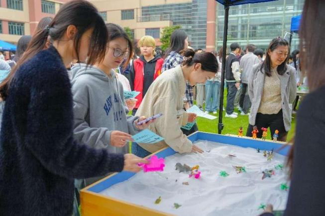 随着礼炮声响起,活动正式开始。本次心理游园会活动是我校2024年心理健康月系列活动的第一站,现场共设立10个活动体验区,活动形式丰富多样,涵盖心理健康教育多个方面的内容。“OH卡牌”“房树人测试”“沙盘游戏”3个心理投射测试体验区运用专业的心理投射测试让学生通过卡牌解读、绘画、创造沙盘世界的方式与自己进行对话,了解自己的人格特质,挖掘个人潜能;“与爱同行”“心海拾贝”“摸石过河”“时间胶囊”等7个游戏互动体验区通过精心设计的游戏和挑战,激发了参与者的合作和竞争意识。