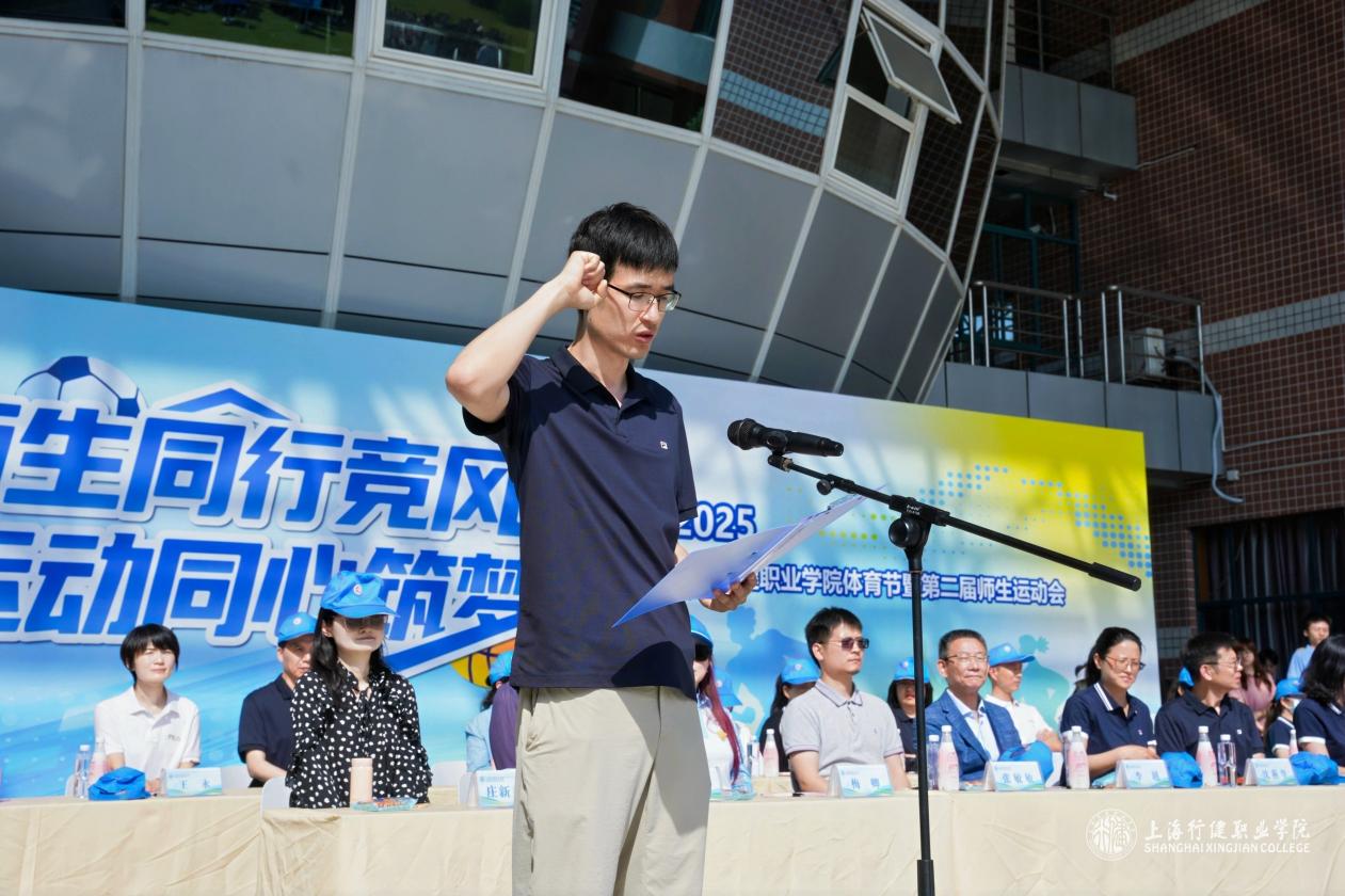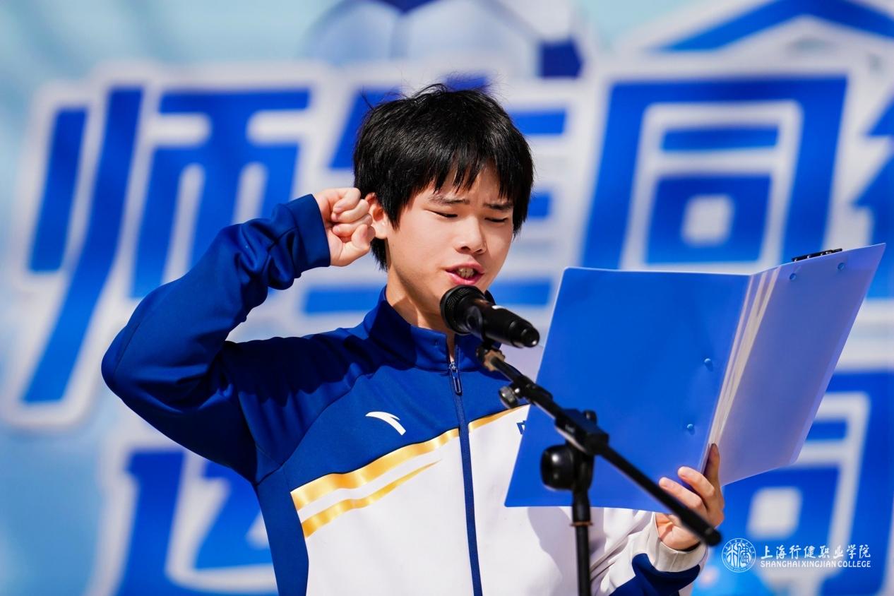 上海市学生运动会自行车比赛高校组金牌获得者、我校学生周子雄和学校体育学科组组长江志鹏代表全体运动员和裁判员进行宣誓。