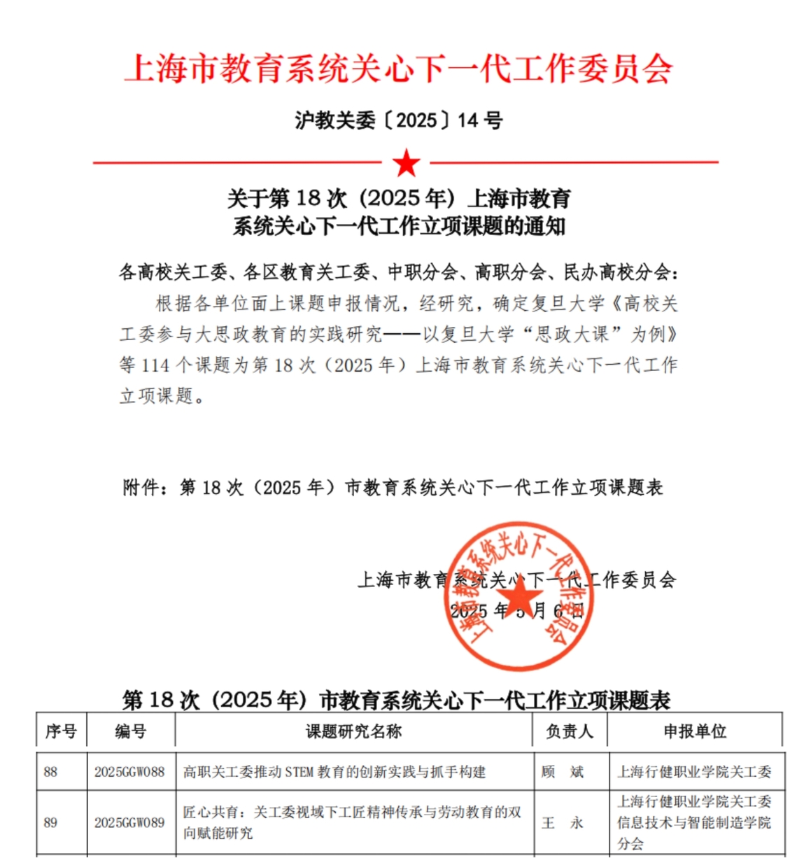 近日,2025年上海市教育系统关心下一代工作市级立项课题揭晓。我校《高职关工委推动STEM教育的创新实践与抓手构建》《匠心共育:关工委视域下工匠精神传承与劳动教育的双向赋能研究》共2项课题入选市级立项。这是我校关工委深化育人实践、创新工作机制的重要成果,标志着学校关心下一代工作在理论研究与实践探索层面迈上了新台阶。