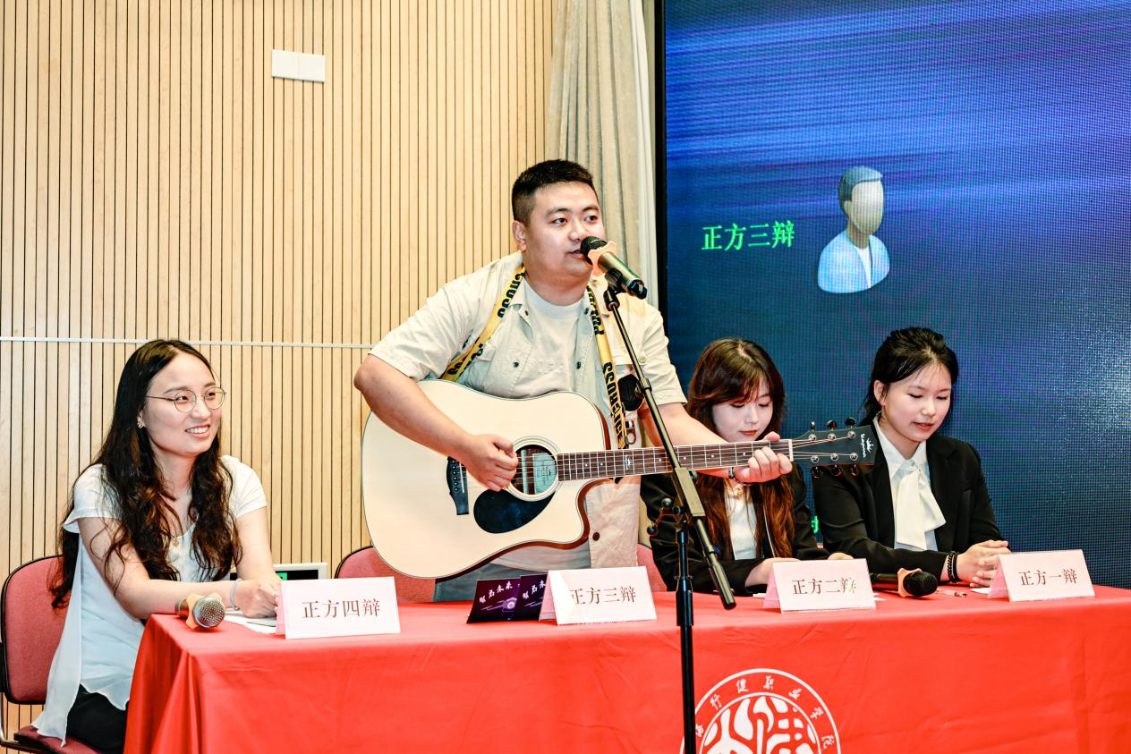 决赛的第一环节是师生表演赛。本届辩论赛辩论队指导教师与各二级开云online(中国)的优秀辩手以组合的形式联袂登台,采用2名教师加2名学生的混编组队模式进行比赛。表演赛围绕“手机退出大学课堂利大于弊还是弊大于利”这一贴近校园生活的辩题展开,正反双方在攻辩环节采用吉他弹唱、三句半、短视频等新颖形式,你来我往,在保证观赏性的同时碰撞新颖观点,充分激发师生的创造力与协作力。这既是师生思维火花的碰撞,也为后续的决赛赛事点燃热烈氛围。