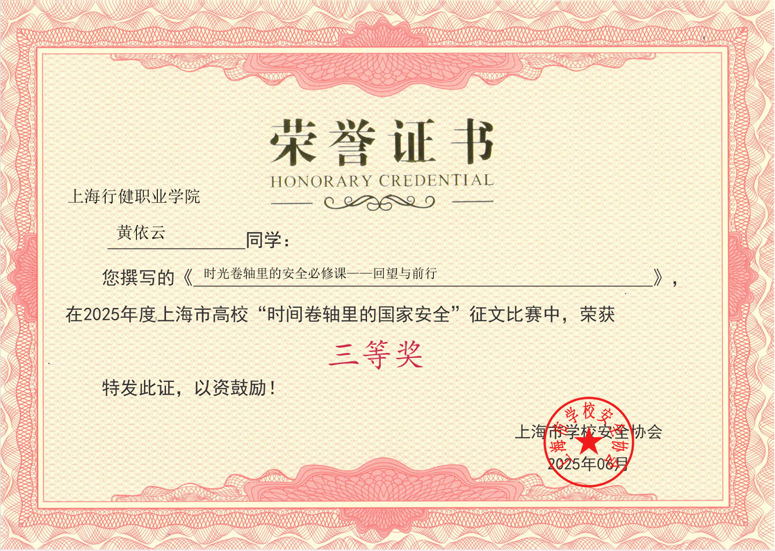 拓宽实践平台,提升育人实效。配合上海市教委、上海市学校安全协会举办“时光卷轴里的安全必修课”主题征文活动,共收到21篇投稿征文,黄依云、李佳慧、陈颜怡、王雅琪、曹峻桀五位同学获得校一等奖并推送参与市级评比,黄依云同学的征文——《时光卷轴里的安全必修课——回望与前行》获得上海市三等奖。