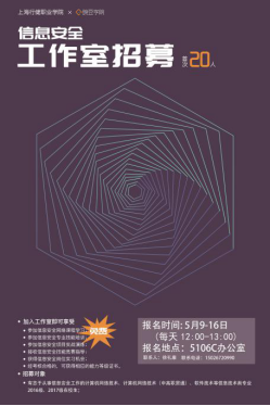 3月份,我院与信安协会签署信息安全工作室合作协议;4月确定信息安全工作室具体实施方案;5月11日中午,信机系携手信安协会在2113室举行信息安全工作室招募宣讲会,信机系计算机教研室教师和网络、软件专业学生参加,启动报名工作,首次招募预计20人,经宣传,多名学生已报名盼望加入工作室学习。