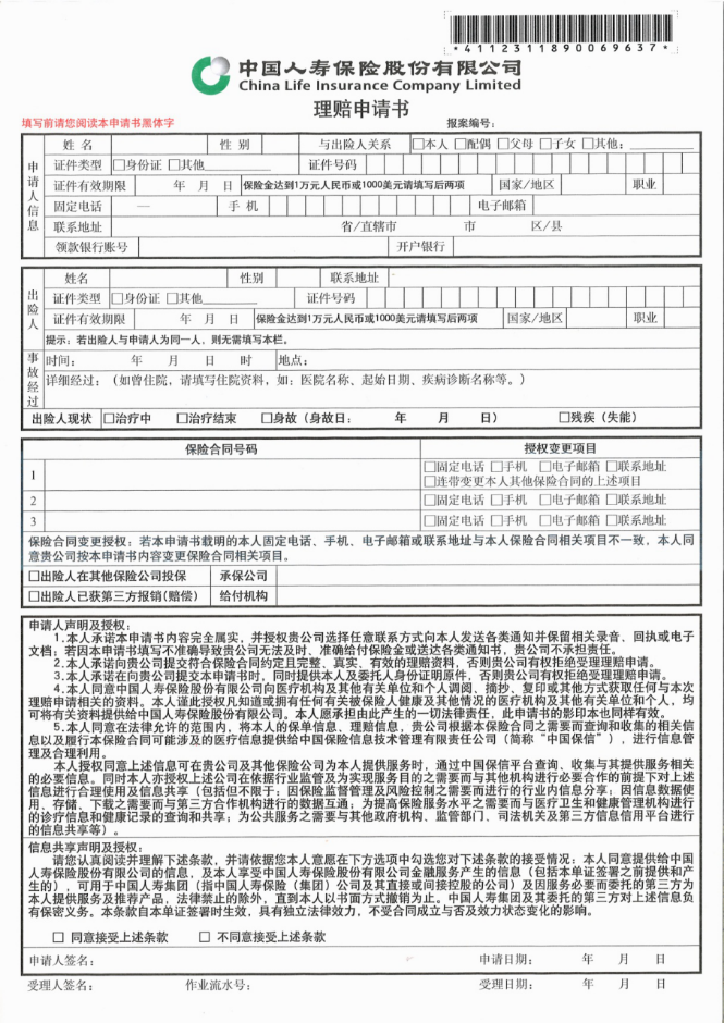 理赔申请书(纸质理赔时需提供)