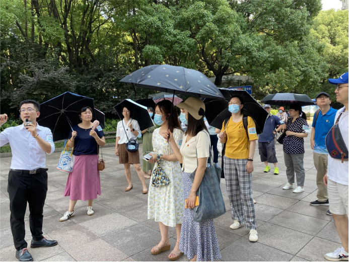 随后,大家到了上海历史博物馆的顶楼,顶楼是一片空旷的花园楼阁,一览无遗可见的上海最具有标记性的大厦高楼。紧接着,大家边听讲解,边打卡人民公园、大光明电影院、国际饭店、体育大厦、金门大酒店、五卅惨案纪念馆等具有代表性的地标建筑,进一步直观感受上海的发展变迁。