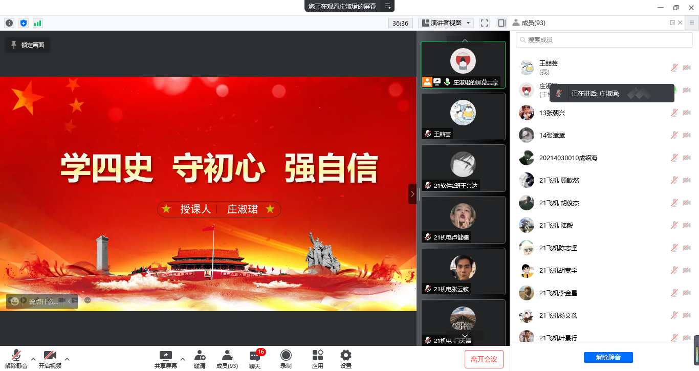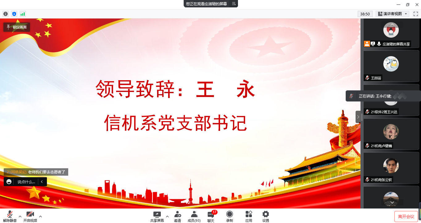 3月23日,信机系以“学四史 守初心 强自信”为主题组织线上入团积极分子团课培训,团课由信机系团总支书记庄淑珺主持,信机系党支部书记王永以及信机系93名入团积极分子与会。