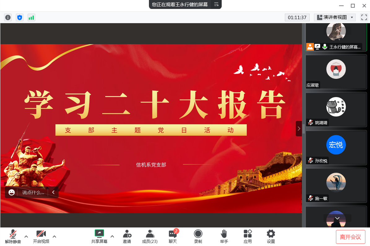 11月4日,信机系党支部以“学习党的二十大精神 做新时代合格党员”为主题,组织开展线上主题党日活动,活动由信机系党支部书记王永主持,信机系全体党员教师参加。