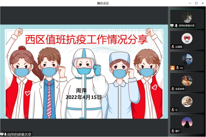 会上,党员教师周萍老师首先介绍了自己在学校西区一线抗疫工作内容,包括:每天三餐的发放、抗原、口罩等防疫物资的发放、帮助学生配药、关注学生心理健康等等。从最初的临危受命、物资紧张,到后续各项工作摸排清楚,有序开展,所有的值班老师、学生志愿者都付出了很多。此外,周萍老师还是四个班级学生的辅导员,做好学生日常管理和对班级隔离点学生的关心更是刻不容缓。周萍老师总结道:“我做的事情虽然简单又琐碎,但却非常重要,守好学校,需要我们每个人的用心付出。我深深感受到,只有有责任心、爱心、耐心、不惧风险的勇敢之心才能更好助力我做好一线抗疫的点滴工作。这期间,也特别感谢在困难时候相互帮助的同事,致敬每一位坚守岗位的行健人。”