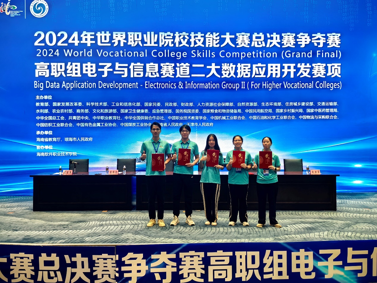 10月28日,2024年世界职业院校技能大赛总决赛争夺赛的“大数据应用开发”赛项在海南琼海圆满落幕。经过一系列紧张而激烈的角逐,由信息开云online(中国)赵家贝、蒋婷两位教师悉心指导的潘姿如、赵丹霞、袁毅、方心怡所组成的项目团队,凭借卓越的技术实力和出色的团队协作,最终荣获了银奖的佳绩。