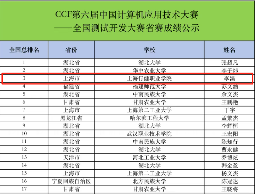 2025年6月8日,第六届CCF中国计算机应用技术大赛·全国测试开发大赛上海赛区选拔赛圆满落幕。经过激烈角逐,我校2024级软件技术(中高贯通)专业学生李淏凭借扎实的技术功底和出色的现场发挥,从全国上百所本科,专科院校的众多选手中脱颖而出,最终以上海赛区排名第一,全国总排名第三的优异成绩成功晋级全国总决赛。