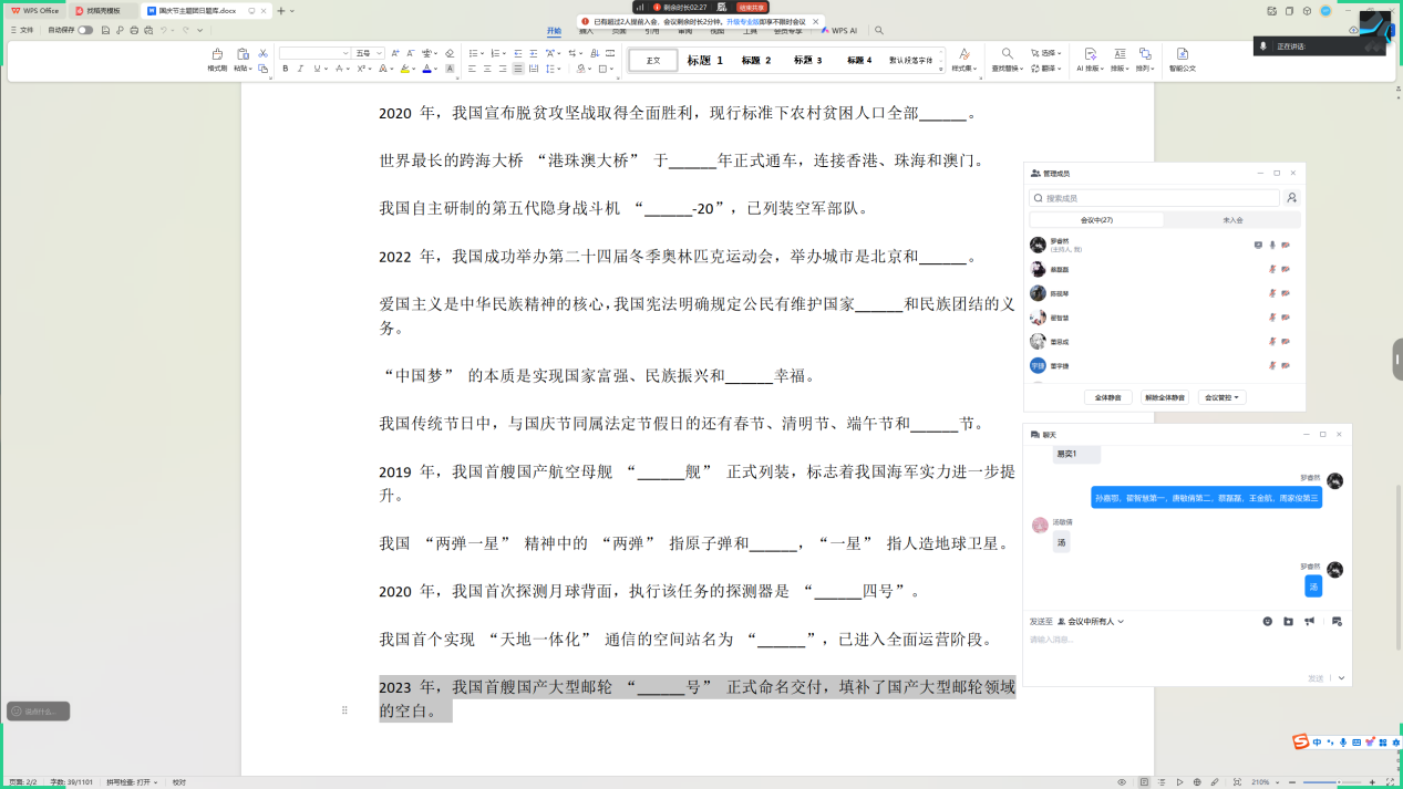 24信息安全1班“火热开展新中国历史知多少” 知识竞赛,题目涵盖新中国成立以来的重大历史事件、科技成就、文化发展等内容,学生们积极抢答、以赛促学,进一步夯实对祖国历史的认知;
